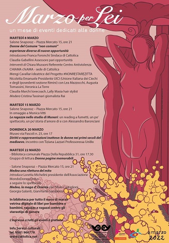 CATTOLICA (RN) – L’Amministrazione Comunale di Cattolica dedica il mese di marzo al racconto delle donne e attraverso la proposta di vari appuntamenti aperti e gratuiti. Si parte domani, martedì 8 marzo alle 21, al Salone Snaporaz (Piazza Mercato, 15), con l’evento Donne del Comune “non comuni”: esperienze diverse di nuove opportunità. L’incontro verrà moderato dalla giornalista Rai Cristina Tassinari. L’introduzione sarà a cura della Sindaca di Cattolica, Franca Foronchi, e dell’Assessora alle pari opportunità, Claudia Gabellini. Previsti gli interventi di Chiara Mussoni (Referente Centro Antiviolenza CHIAMA ChiAMA – sede di Cattolica), Mengi Cavallari (ideatrice del Progetto #nonrestarezitta), Nicoletta Emanuele (Presidente UICI – Unione Italiana dei Ciechi e degli Ipovedenti sezione Rimini) con Lea Mazzocchi, Augusta Tomassini, Veronica La Torre, Claudia Marchi (Lovecoach), Lally Masia (Hair stylist).