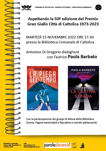 In questo contesto, il prossimo martedì 15 novembre 2022, alle ore 17:30, il Centro Polivalente-Biblioteca Comunale di Piazza della Repubblica 31, ospiterà l’autrice Paola Barbato che presenterà le sue opere “La Cattiva strada” (Piemme) e “La piega del tempo” (Il battello a Vapore). Converserà con l’autrice Antonino Di Gregorio (paroledarancio).