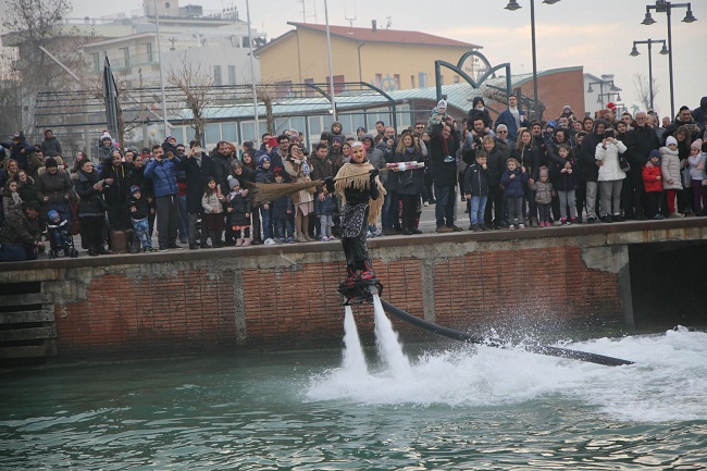 La Befana oggi a Cattolica è arrivata dal mare, su moto d’acqua e volteggiando col flyboard, per un applaudito show acquatico a cura di 3zero3 Team.