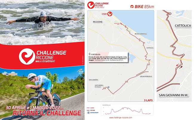 CATTOLICA (RN) – Nella giornata di domenica 1 Maggio la città di Cattolica vedrà il passaggio degli atleti impegnati nella competizione di triathlon “Challenge Riccione”. In particolare saranno interessate le vie Ponte Conca, Po e Marecchia (SP121) rientranti nel percorso ciclistico che prevede tre passaggi (un percorso complessivo di 85 Km da ripetersi tre volte).