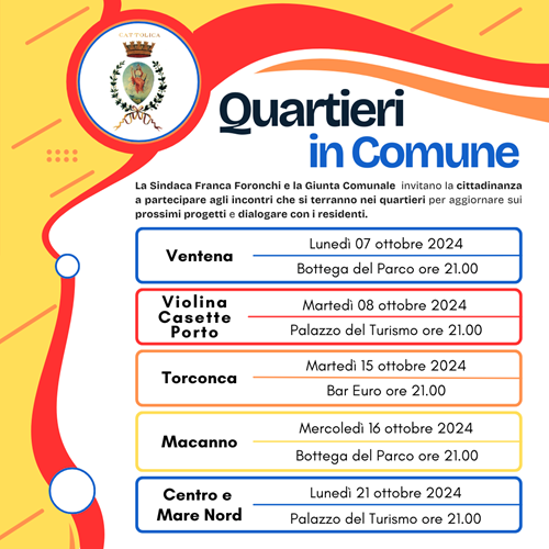 Il primo incontro è fissato per lunedì 7 ottobre, alle ore 21, presso la Bottega del Parco al Parco della Pace, con i residenti del Ventena. Il secondo appuntamento il giorno dopo, martedì 8 ottobre, alle ore 21, presso il Palazzo del Turismo i cittadini del quartiere Violina Casette Porto. Gli altri 3 appuntamenti saranno martedì 15 ottobre al bar Euro con il quartiere Torconca, mercoledì 16 ottobre alla Bottega del Parco con il Macanno ed, infine, lunedì 21 ottobre al Palazzo del Turismo con i residenti dei quartieri Centro e Mare Nord.