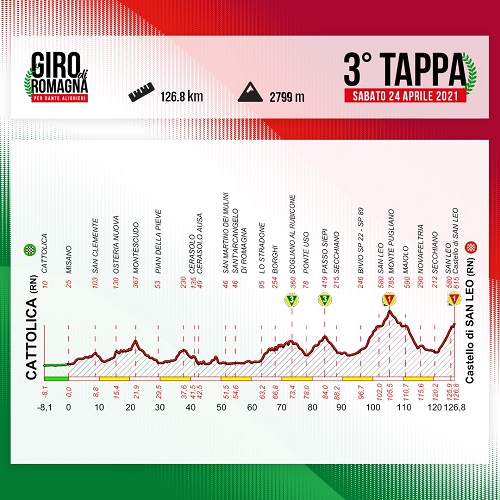 CATTOLICA (RN) – Si corre sabato, 24 aprile, la “Cattolica – San Leo”, terza tappa del “Giro di Romagna” per Dante Alighieri. Sicuramente l’appuntamento più impegnativo della manifestazione ciclistica: la partenza da Cattolica è l’inizio di 126km fatti salite e discese che metteranno a dura prova i corridori. Gli ultimi 8 km tutti in salita verso il maestoso Castello si San Leo saranno l’ultimo ostacolo da superare per conquistare la vittoria.