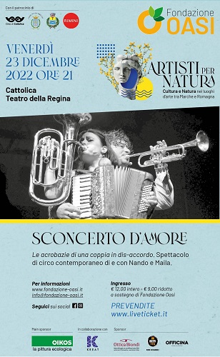 PRIMO SPETTACOLO. La rassegna prenderà avvio il prossimo venerdì 23 Dicembre presso il Teatro della Regina di Cattolica con un appuntamento per tutta la famiglia: Sconcerto d’amore di Nando & Maila. Andrà in scena una storia d’amore travagliata, nella quale ognuno potrà riconoscersi, attraverso l’ironia e le “Acrobazie Musicali” di una coppia in disaccordo. Nando e Maila hanno fatto una scommessa: giocare ai musicisti dell’impossibile trasformando la struttura autoportante, dove sono appesi il trapezio e i tessuti aerei, in un’imprevedibile orchestra di strumenti. I pali della struttura diventano batteria, contrabbasso, violoncello, arpa e campane che insieme a strumenti come tromba, bombardino, fisarmonica, violino e chitarra elettrica, creano un’atmosfera magica definendo un insolito mondo sonoro. Sarà un concerto-spettacolo comico con acrobazie aeree, giocolerie musicali e prodezze sonore che abbraccia la filosofia di Fondazione OASI in tema di recupero e sostenibilità.