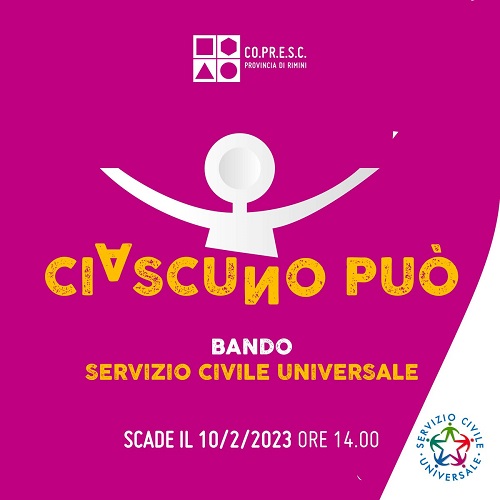 Per chi fosse interessato, Copresc Rimini (segreteria e sportello informativo sul Servizio Civile in provincia di Rimini) organizza tre incontri nei prossimi giorni per illustrare i contenuti del bando e gli elementi utili da sapere. La prima tappa del ‘tour informativo’ è prevista a Riccione il 23 gennaio alle ore 17 negli spazi della Biblioteca comunale. A seguire, il 25 gennaio, alle 17, appuntamento a Santarcangelo di Romagna presso la Biblioteca A. Baldini e a Rimini, il 26 gennaio, alle ore 17.30, con un incontro a Casa Pomposa.