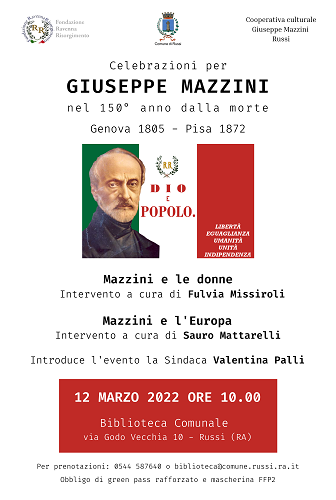 Sabato 12 marzo alle ore 10 in Biblioteca, con gli interventi di Fulvia Missiroli e Sauro Mattarelli rispettivamente sulla relazione tra la figura di Mazzini e le donne e sui rapporti tra Mazzini e l’Europa