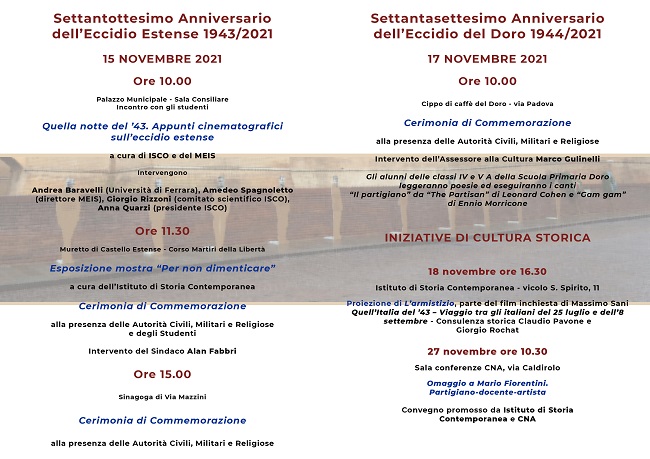 FERRARA – Con le cerimonie commemorative in programma lunedì 15 e mercoledì 17 novembre 2021 – per celebrare rispettivamente il settantottesimo anniversario dell’Eccidio Estense del 15 novembre 1943 e il settantasettesimo anniversario dell’Eccidio del Doro del 17 novembre 1944 – entrerà nel vivo il calendario di appuntamenti, che si protrarrà fino al 27 novembre, messo a punto dal ‘Comitato per le Onoranze’ di Ferrara’.
