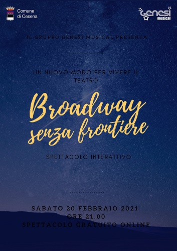 CESENA – The show must go on. La pandemia ha modificato le abitudini di tutti e persino il modo di pensare alla cultura e agli eventi dal vivo inducendo gli operatori del mondo dello spettacolo a sperimentare linguaggi diversi, poco esplorati e certamente al passo con i tempi. Da questa premessa prende avvio l’esperienza del Gruppo Genesi Musical che sabato 20 febbraio, alle 21, sulla propria pagina Facebook e sul canale YouTube di riferimento, presenterà l’evento “Broadway senza frontiere – Spettacolo interattivo”, un nuovo modo di fare intrattenimento su un palcoscenico del tutto virtuale.