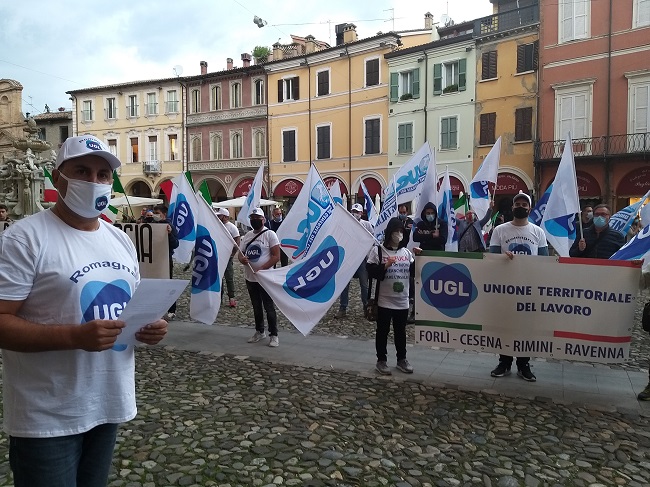 così Filippo Lo Giudice, segretario territoriale di Ugl Forlì-Cesena-Rimini-Ravenna, lunedì pomeriggio in piazza del Popolo a Cesena, sotto le finestre del Municipio e della giunta.
