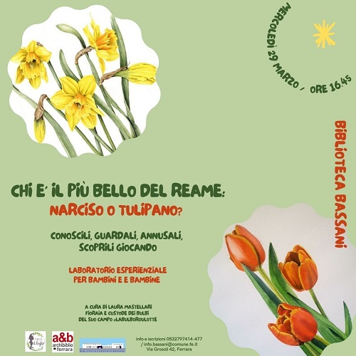 FERRARA – “Chi e’ il più bello del reame, tulipano o narciso?”. Mercoledì 29 marzo 2023 alle 16.45 appuntamento per i bambini dai 4 anni alla biblioteca comunale Bassani (via Grosoli 42, zona Barco, Ferrara) per un laboratorio di riconoscimento e composizione floreale, con Laura Mastellari fioraia e custode dei bulbi del suo campo @labulboroulotte.