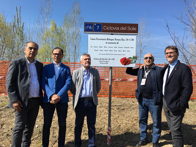 CREVALCORE (BO) – Hanno preso il via questa mattina a Crevalcore i cantieri della Ciclovia del Sole sull’ex ferrovia Bologna-Verona. La cerimonia di avvio, a cui hanno partecipato gli amministratori di Città metropolitana e Comune di Crevalcore accompagnati dal CT della nazionale italiana ciclismo su strada e presidente di Apt Emilia-Romagna Davide Cassani, è avvenuta in un luogo particolarmente significativo: a Bolognina di Crevalcore nel punto in cui, nel 2005, avvenne il tragico incidente ferroviario che provocò la morte di 17 persone.
