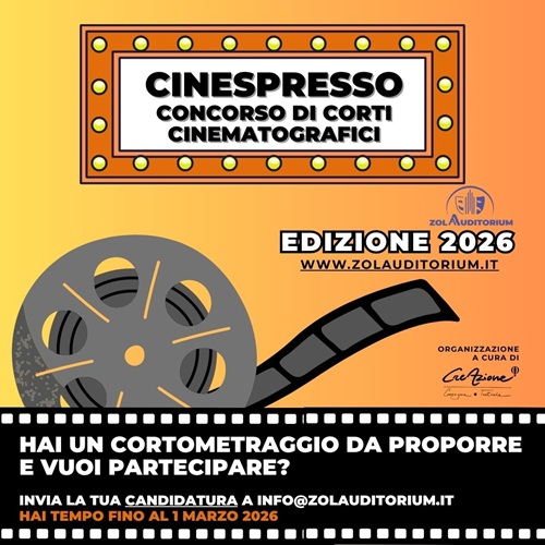 ZOLA PREDOSA (BO) – È ufficialmente aperto il BANDO per partecipare alla seconda edizione di Cinespresso – Concorso di Corti Cinematografici, promosso da CreAzione Teatro, dal 2022 alla direzione artistica e organizzativa dello ZolAuditorium, in collaborazione con il Comune di Zola Predosa, con l’obiettivo di sostenere e valorizzare la produzione cinematografica indipendente.