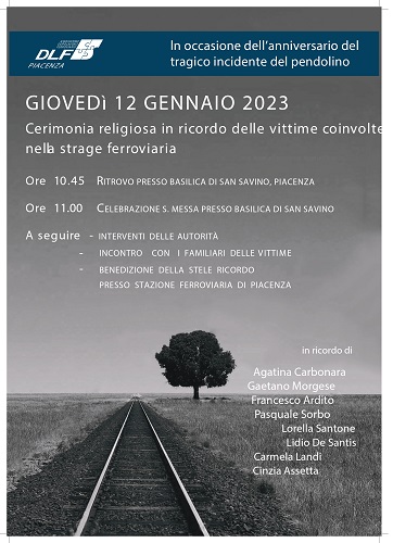 PIACENZA – Si terrà giovedì 12 gennaio alle 11, nella Basilica di San Savino, la celebrazione religiosa in memoria delle vittime dell’incidente che 26 anni fa provocò, all’imbocco della stazione ferroviaria di Piacenza, il deragliamento del treno Etr Botticelli, causando la morte di otto persone.