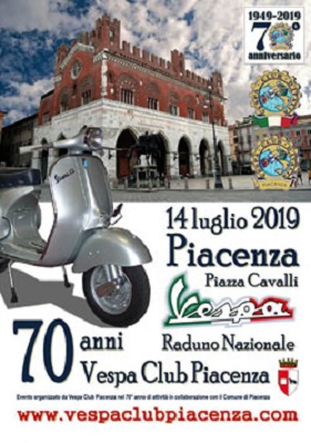Domenica 14 luglio 2019, in Piazza Cavalli nel cuore del centro storico della città di Piacenza, è previsto il Vespa Raduno nazionale “70 anni Vespa Club Piacenza”.