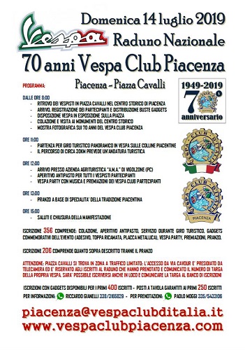 La manifestazione è dedicata alla celebrazione dei 70 anni di attività dell’associazione piacentina dedicata al mondo Vespa in tutte le sue sfumature. Sarà una grande festa con la partecipazione di vespisti provenienti dai Vespa Club di tutta l’Italia (isole comprese).