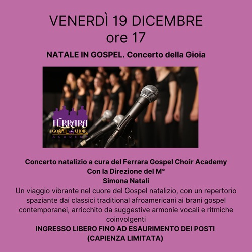 FERRARA – Un viaggio vibrante nel cuore del Gospel natalizio: è il “Concerto della Gioia” con cui venerdì 19 dicembre 2025 alle 17:00 la Ferrara Gospel Choir Academy animerà la sala Agnelli della biblioteca comunale Ariostea (via Scienze 17 Ferrara). A dirigere il coro sarà il M° Simona Natali.