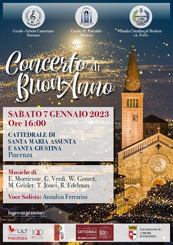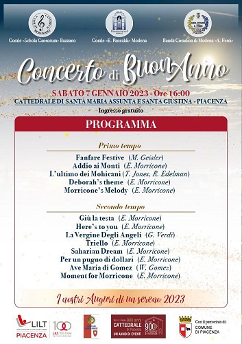 La Lega Italiana Lotta ai Tumori (sede di Piacenza) in unione con il Rotary Farnese, porgono gli Auguri di un Buon Inizio d’Anno alla cittadinanza intera con un concerto unico, fatto di una miscellanea di brani tratti dalle colonne sonore dei film più noti e dalle più famose arie d’opera, con particolare riguardo al grande Maestro Ennio Morricone, a cui si vuole porgere un tributo per la recente scomparsa.