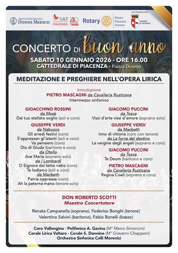 PIACENZA – Si è svolta il 7 gennaio, presso la sala del Consiglio comunale in Municipio, la conferenza stampa di presentazione del “Concerto di Buon Anno”, evento organizzato dalla Lega Italiana Lotta ai Tumori in unione con il Rotary Club Piacenza Farnese e l’Associazione Italiana Donne Medico, con il patrocinio del Comune di Piacenza.