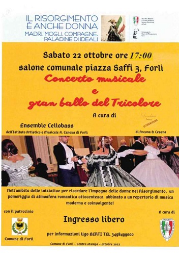 FORLÌ – Sabato 22 ottobre alle ore 17.00 presso il Salone Comunale di Forlì, piazza Saffi n. 8 si svolgerà il Concerto Musicale e il Gran Ballo del Tricolore, organizzato da Ensemble Cellobass dell’Istituto Artistico e Musicale A. Canova di Forlì e Accademia Danze Ottocentesche di Ancona & Cesena, a cura dell’Associazione Nazionale Mutilati Invalidi di Guerra con il patrocinio del Comune di Forlì. L’evento si inserisce nell’ambito delle iniziative organizzate per ricordare l’impegno delle donne nel Risorgimento, “Il Risorgimento è anche donna, madri, mogli, compagne paladine di ideali. Un pomeriggio di atmosfera romantica ottocentesca abbinato a un repertorio di musica moderna e coinvolgente.