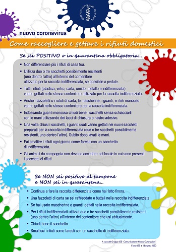 1 – Se si è positivi al CORONAVIRUS o si è in quarantena obbligatoria, l’indicazione è quella di non differenziare più i rifiuti di casa sino al risolversi della situazione di contagio, e quindi di conferire tutti i rifiuti (plastica, vetro, carta, umido, metallo e indifferenziata) nel rifiuto residuo. Il conferimento dovrà avvenire utilizzando due o tre sacchetti resistenti (uno dentro l’altro) all’interno del contenitore utilizzato per il rifiuto residuo, se possibile a pedale.
