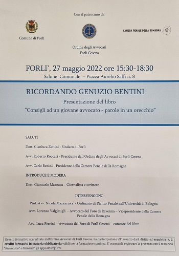L’incontro si svolgerà nel Salone Comunale (ingresso PIazza Saffi 8) nel pomeriggio del 27 maggio, dalle ore 15.30 alle ore 18.30 e verrà aperto dai saluti del Sindaco Gian Luca Zattini, del Presidente dell’Ordine Roberto Roccari e del Presidente della Camera Penale della Romagna Carlo Benini. Interverranno il Prof. Nicola Mazzacuva (Ordinario di Diritto Penale nell’Università di Bologna), Lorenzo Valgimigli (Vice presidente della Camera Penale) e l’avvocato Luca Ferrini che ha curato la riedizione del testo. Introdurrà e coordinerà l’evento Giancarlo Mazzuca, giornalista, scrittore, già direttore del Resto del Carlino e del Giorno, nonché vice di Indro Montanelli alla Voce. Il Consiglio , visto l’argomento, e ritenendo la nostra storia professionale materia da non trascurare, ha stabilito , con l’approvazione della Commissione Accreditamento, di riconoscere ai partecipanti crediti in tema di formazione obbligatoria.