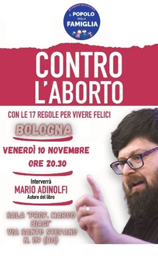 BOLOGNA – Mario Adinolfi, scrittore, giornalista e presidente del Popolo della Famiglia torna a Bologna venerdì 10 novembre 2023 alle ore 20.30 presso la sala Prof. Marco Biagi al quartiere Santo Stefano, per presentare il suo nuovo libro dal titolo “CONTRO L’ABORTO con le 17 regole per vivere felici”, che affronta il tema dell’aborto e la necessità di rimettere al centro il rispetto della vita dal suo concepimento, anche per vincere l’inverno demografico in Italia.