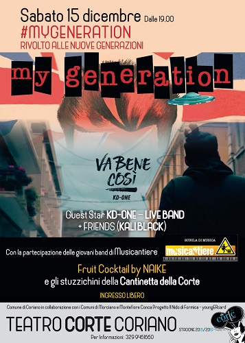 CORIANO (RN) – Sabato 15 dicembre dalle ore 19 presso il Teatro CorTe di Coriano andrà in scena un evento unico: #MYGENERATION. Una serata dedicata alle nuove generazioni, una serata dedicata alla musica. Teatro CorTe dopo essere stato Jazz Club è pronto a cambiare ancora una volta la propria connotazione: per l’occasione il teatro si trasformerà in un Club underground che ospiterà le giovani band di Musicantiere in una kermesse incalzante e coinvolgente. Musicantiere Associazione Culturale è un progetto ideato da musicisti con una lunga esperienza nel settore della musica finalizzato alla divulgazione della cultura musicale. L’obiettivo è quello di creare un momento di aggregazione tramite il canale MUSICA e, allo stesso tempo, fornire elementi che permettano di conseguire un’abilità musicale. Il nome stesso racchiude la mission dell’associazione: valorizzare l’individuo costruendo un proprio percorso formativo e musicale, partendo dai propri gusti ed esigenze. Il risultato finale è fornire un servizio che sia alla portata di tutti garantendo professionalità e qualità.