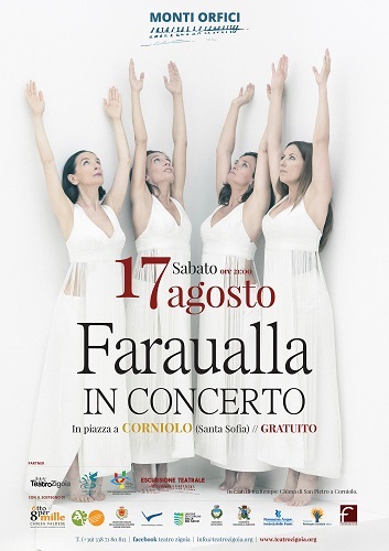 SANTA SOFIA (FC) – Il 17 Agosto 2019 a Corniolo (Santa Sofia) – FC – ore 21.00, in piazza, è in programma il concerto delle Faraualla, unica tappa 2019 in Emilia – Romagna per l’importante gruppo vocale Pugliese. Il piccolo e suggestivo Centro di Corniolo a ridosso del Parco Nazionale delle Foreste Casentinesi, Monte Falterona e Campigna, sarà il prezioso palcoscenico naturale per una serata speciale di arte e festa organizzata con la Direzione Artistica del Teatro Zigoia in collaborazione e con il sostegno del Comune di Santa Sofia.