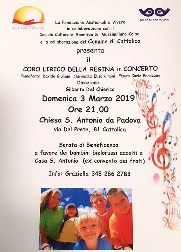CATTOLICA – La Fondazione “Aiutiamoli a vivere” in collaborazione con il Circolo Culturale-Sportivo S. Massimiliano Kolbe ed il patrocinio del Comune di Cattolica, Assessorato ai Servizi Sociali, presenta il Coro Lirico della Regina in concerto la prossima domenica 3 marzo 2019 alle ore 21.00 presso la Chiesa S. Antonio da Padova in via Del Prete 81.