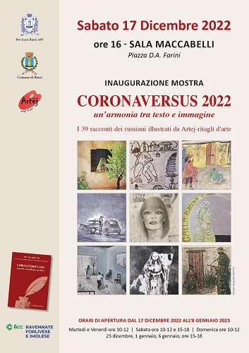 RUSSI (RA) – Sabato 17 dicembre alle ore 16.00, presso la Sala Maccabelli – ex Chiesina in Albis, si inaugurerà una mostra che è frutto della collaborazione fra le associazioni Pro Loco Russi APS e Artej – ritagli d’arte; saranno infatti esposte le illustrazioni dei racconti russiani che fanno parte del volume Coronaversus 2022 – Racconti e novelle per un anno.