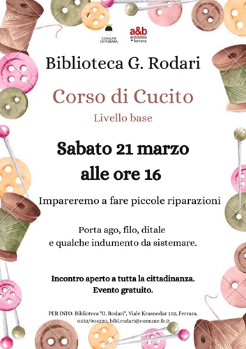 FERRARA – Torna l’appuntamento, sabato 21 marzo 2026 alle 16:00, con il “Corso di cucito, livello base” alla biblioteca comunale Rodari di Ferrara (viale Krasnodar 102). Sotto la guida di una sarta professionista, i partecipanti potranno fare pratica con l’arte dell’ago e del filo, imparando piccoli lavoretti di cucito.