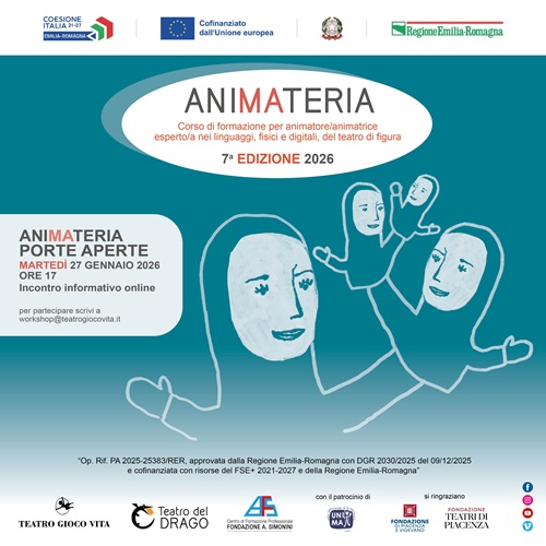 ANIMATERIA è un corso di alta formazione che si propone di preparare professionisti/e competenti nelle tecniche e nei linguaggi fisici e digitali del teatro di figura. Il successo delle prime sei edizioni – più di 300 i/le candidati/e provenienti da tutta Italia e residenti o domiciliati/e in regione Emilia Romagna; 110 i/le selezionati/e con una età media di 28 anni; più di 60 i/le docenti e gli/le artisti/e complessivamente coinvolti/e – confermano ANIMATERIA come luogo privilegiato di formazione, ma anche di sperimentazione, sul teatro di figura contemporaneo. Capofila come sempre Teatro Gioco Vita, in quanto ente di formazione professionale accreditato dalla Regione Emilia-Romagna con alle spalle una lunga pratica nel teatro di figura e considerato tra i maestri del teatro d’ombre contemporaneo occidentale. Il progetto formativo 2026 è finanziato dalla Regione Emilia-Romagna e dal Fondo Sociale Europeo (“Op. Rif. PA 2025-25383/RER, approvata dalla Regione Emilia Romagna con DGR 2030/2025 del 09/12/2025 e cofinanziata con risorse del FSE+ 2021-2027 e della Regione Emilia-Romagna”). Partecipano alla progettazione e realizzazione del corso, che ha il patrocinio di Unima Italia (Unione Internazionale della Marionetta), Teatro del Drago di Ravenna e Fondazione Alberto Simonini di Reggio Emilia. Per le attività di formazione teatrale Teatro Gioco Vita si avvale della collaborazione di Fondazione di Piacenza e Vigevano e Fondazione Teatri di Piacenza. Diversi i partner promotori, italiani e stranieri.