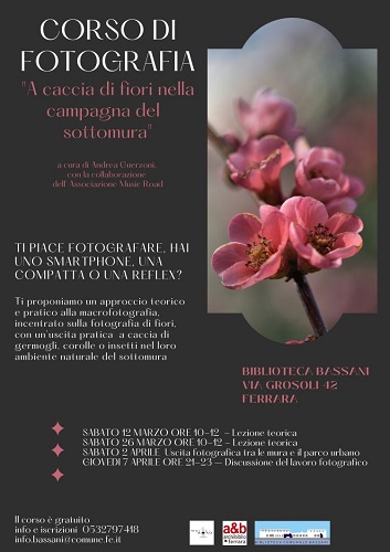 FERRARA – Un corso di fotografia intitolato “A caccia di fiori nella campagna del sottomura” quello organizzato dalla Biblioteca Bassani (via Grosoli 42, Barco di Ferrara) e al via da sabato 12 marzo 2022 per quattro appuntamenti (due lezioni teoriche nelle mattine di sabato 12 e sabato 26 marzo, un’uscita pratica il pomeriggio di sabato 2 aprile e discussione sul lavoro la sera di venerdì 8 aprile). Il corso è gratuito.
