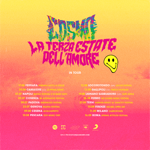 Con uno show coinvolgente, tra grandi brani del passato e pezzi più recenti dall’ultimo progetto discografico LA TERZA ESTATE DELL’AMORE (Columbia Records / Sony Music Italy / 42 Records), COSMO è pronto a stregare il suo pubblico e a trascinarlo nella sua grande festa. Info e prevendite www.dnaconcerti.com. I biglietti della data di MILANO al Carroponte sono disponibili dalle 11:00 di domani, 27 aprile, su dice.fm.