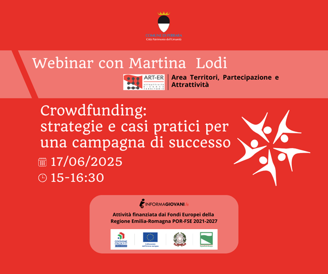FERRARA – Si parlerà di “Crowdfunding: strategie e casi pratici per una campagna di successo”, nel secondo incontro del ciclo di webinar per giovani e studenti, in programma martedì 17 giugno 2025 dalle 15:00 alle 16:30, organizzato da ART-ER in collaborazione con Informagiovani dell’U.O. Nuove Generazioni del Comune di Ferrara.