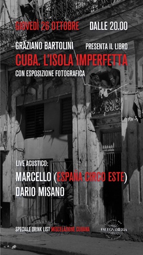Sarà una serata tutta dedicata a Cuba quella di giovedì 26 ottobre alla Falegnameria Cocktail bar di Longiano in piazza Malatestiana, davanti al castello della città, attraverso la musica, la letteratura, la fotografia, i cocktails ma soprattutto le pagine del libro “Cuba, L’isola imperfetta “cui l’autore, il fotografo Graziano Bartolini, affida la propria volontà di raccontarsi attraverso le esperienze vissute in trentaquattro anni di viaggi nell’isola, dando vita a un sentito diario di viaggio, che per l’occasione sarà in dialogo con Maria Chiara Pacchierini. L’evento organizzato in collaborazione con Monogawa sarà ad ingresso libero e prenderà vita già dalle ore 20.00 con possibilità di cena e sarà arricchito dal live acustico di Marcello leader della band Espana Circo Este e Dario Misano che realizzeranno un nuovo ed originale intervento musicale acustico con due chitarre e voce, tutto dedicato all’america latina e alle sue influenze musicali. Durante la presentazione del libro saranno proiettate anche le foto che Graziano ha realizzato durante i suoi viaggi e ad accompagnare la serata anche i drink della falegnameria che per l’occasione ha preparato una carta speciale dedicata alla miscelazione dell’isola caraibica.