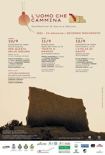 REGGIO EMILIA – Il “secondo movimento” del NonFestival di Sacro e Natura L’UOMO CHE CAMMINA, rassegna di letteratura, musica, teatro e arte, si tiene dal 10 al 12 settembre nei Comuni di Castelnovo ne’ Monti e Vetto, a Rosano, in provincia di Reggio Emilia. Quattro appuntamenti, tutti accompagnati da musica dal vivo, che arricchiscono la quarta edizione ispirata, nell’anniversario della morte di Dante Alighieri, al Sommo Poeta che citò la Pietra di Bismantova, simbolo di questi luoghi dell’Appennino Reggiano, nel Purgatorio*. Venerdì 10 alle 18 la presentazione del libro “Per questa selva oscura” di Giulio d’Onofrio, che apre prospettive inedite e rivoluzionarie sulle fonti del pensiero e dell’opera di Dante, e alle 21 la lettura musicale di alcuni passi del libro con un Virgilio d’eccezione, l’attore Corrado Tedeschi (alle 21 i posti sono limitati con prenotazione obbligatoria su www.codazero.it). Sabato alle 18 la poetessa Franca Mancinelli dialoga con Simone Pellegrini, Andrea Franzoni e Fabio Orecchini sull’ecosistema delle poetesse del Trecento, contemporanee di Dante, in una serata musicale intitolata provocatoriamente “Tacete o maschi”. Domenica, sempre alle 18, “Un viaggio nel Paese della Commedia” con Giulio Ferroni che parla dell’Italia di Dante con Gino Ruozzi e Giampiero Lupatelli.