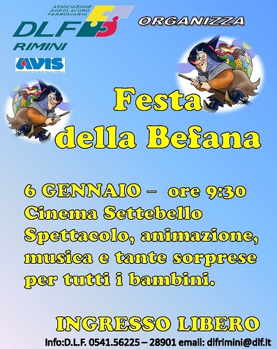 Ma sono ancora tante le Befane da incontrare, a partire dalla mattina alle 9.45 al Cinema Settebello con la tradizionale Festa della Befana del Dopolavoro Ferroviario, che propone spettacolo, animazione, e tante sorprese per tutti i bambini, in collaborazione con Avis Rimini – Associazione Volontari Italiani Sangue OdV, che distribuirà palloncini a tutti i bambini presenti. Ingresso libero. Info: 0541.28901 www.facebook.com/dlfrimini/