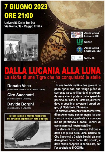 REGGIO EMILIA – L’ Associazione Lucani di Reggio Emilia, COSMo, l’Università della Terza Età e la CRLM della Regione Basilicata, mercoledì 7 giugno alle ore 21.00 a Reggio Emilia in Via Roma 39, presso la sede di UniTre, presentano l’iniziativa “Dalla Lucania alla Luna, storia di una Tigre che ha conquistato le stelle”.“In una fredda mattina del secolo scorso due giovani da poco sposi con due valigie piene di speranze varcano il bordo di una grande nave che li porterà dallo sperduto paesino di Sasso di Castalda (PZ), al Paese dove è possibile avverare i propri sogni, gli Stati Uniti d’America”.