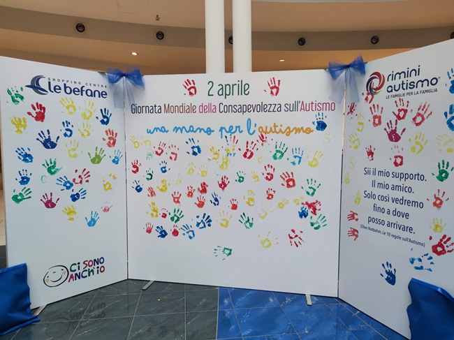 Tutti i visitatori de Le Befane saranno invitati poi durante il pomeriggio, dalle 15.00 alle 19.00, a lasciare l’impronta della propria mano su un pannello allestito in piazza Unieuro: per ogni mano ‘blu’ lasciata su di esso, con un inchiostro lavabile e atossico, il Centro commerciale donerà 1 Euro all’Associazione Rimini Autismo. Il pannello – grande due metri per tre metri – resterà poi in esposizione in piazza Unieuro anche nei giorni seguenti, a continuare la sua opera di sensibilizzazione.