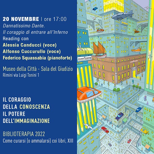 Dannatissimo Dante. Il coraggio di entrare all’Inferno è il titolo del reading che mette in scena la lettura di alcuni brani tratti dall’ ‘Inferno’ di Dante, alternati a narrazioni e riflessioni sulla contemporaneità e sulle passioni che muovono l’uomo. Con le voci narranti di Alessia Canducci e Alfonso Cuccurullo, lettura e narrazione si alterneranno per meglio tradurre suoni ed atmosfere, e dare corpo, voce, immediatezza e presenza all’opera del Sommo Poeta, soddisfacendo orecchio e animo. La musica dal vivo composta ed eseguita da Federico Squassabia con funzione evocativa e drammaturgica sarà co-protagonista. Una immersione nelle atmosfere infernali, per scoprire insieme quanto Dante sia ancora figlio del nostro tempo ed eternamente attuale.
