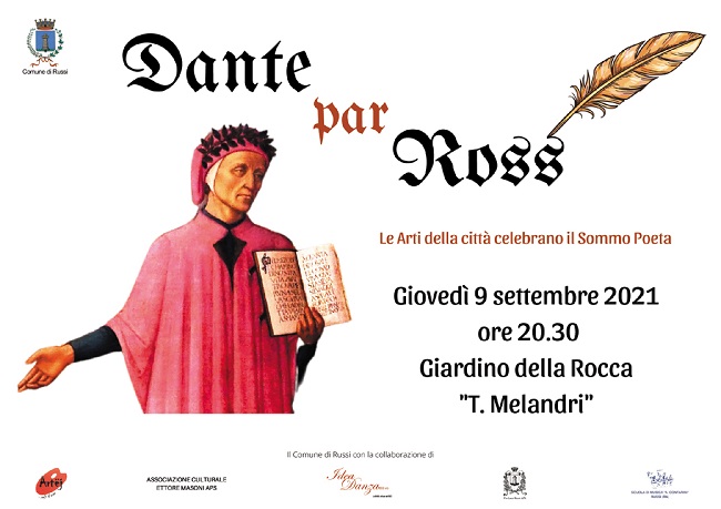 RUSSI (RA) – All’interno delle iniziative dedicate alle celebrazioni del 700° anniversario dalla morte di Dante Alighieri, giovedì 9 settembre alle 20.30 nel giardino della Rocca “Terzo Melandri” il Comune di Russi, in collaborazione con le associazioni del territorio, quali Artej, Ettore Masoni, Idea Danza, Pro Loco e Scuola di Musica Contarini, darà vita a una serata ispirata ai temi delle grandi opere del Sommo Poeta.