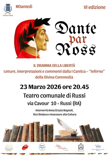 RUSSI (RA) – Dopo il successo delle precedenti edizioni, lunedì 23 marzo 2026 al Teatro comunale di Russi in via Cavour n. 10 (ore 20.45) avrà luogo la sesta edizione di Dante par Ross, quest’anno dedicata al dramma della libertà, una serata promossa e organizzata dal’Amministrazione Comunale, in collaborazione con le associazioni del territorio: Pro Loco, Scuola di musica comunale Antonio Contarini, Artej – ritagli d’arte, Ettore Masoni, IdeaDanza Russi e il gruppo di lettura “Le Faville”.