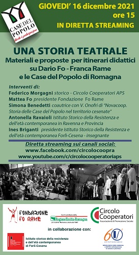 CESENA – Materiali e proposte per itinerari didattici su Dario Fo e Franca Rame e le Case del Popolo di Romagna: se ne parlerà giovedì 16 dicembre 2021, alle ore 15, nel corso di un incontro in diretta streaming promosso dalla Fondazione Fo Rame (e dal Circolo Cooperatori APS. L’evento vede la collaborazione dell’Istituto Storico della Resistenza e dell’età contemporanea in Ravenna e Provincia e dell’Istituto Storico della Resistenza e della Età Contemporanea di Forlì-Cesena, nonché il contributo della Regione Emilia-Romagna (legge regionale n. 3/2016 -Memoria e Storia del Novecento).