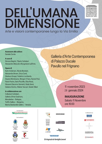 PAVULLO NEL FRIGNANO (MO) – Sabato 11 novembre 2023, alle ore 16.00, presso la Galleria d’arte contemporanea di Palazzo Ducale di Pavullo nel Frignano, in provincia di Modena, sarà inaugurata la mostra collettiva “Dell’umana dimensione. Arte e Visioni contemporanee lungo la Via Emilia” con opere di Karin Andersen, Nicola Biondani, Alessandra Brown, Erica Conti, Gianluca Groppi, Federico Lombardo, Dayana Montesano, Morgan O’Hara, Nunzio Paci, Flavio Pacino, Ilaria Piccirillo, Elisa Rossi, Giovanni Giacomo Sementi, Giulia Sensi, Giuliana Storino, Wainer Vaccari e Gioele Villani.