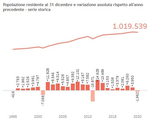 Mentre a livello nazionale si riscontra un declino demografico avviatosi dal 2015, ed accentuato dagli effetti dell’epidemia Covid-19, che mostra una diminuzione dello 0,6%, nel territorio metropolitano è il primo anno che si riscontra una diminuzione nei residenti, alla quale può aver contribuito anche la sistemazione dei flussi anagrafici conseguenti al censimento della popolazione e che solo l’andamento del prossimo biennio potrà o meno confermare.