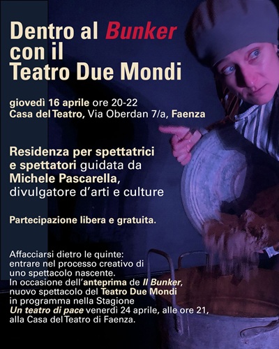 Affacciarsi dietro le quinte di uno spettacolo nascente: accadrà giovedì 16 aprile dalle 20 alle 22 alla Casa del Teatro di Faenza, in occasione dell’anteprima de Il Bunker, nuovo spettacolo del Teatro Due Mondi.
