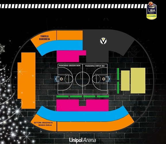 Per agevolare i tantissimi tifosi di Reggio Emilia che vorranno festeggiare il Natale seguendo la Grissin Bon nella trasferta di Bologna, verranno messi in vendita a “lo stoRE” in Piazza Prampolini SOLO i biglietti del Settore Ospiti (nell’immagine, lo spicchio della fascia arancione in basso a sinistra, situata di fronte alla panchina della Grissin Bon).