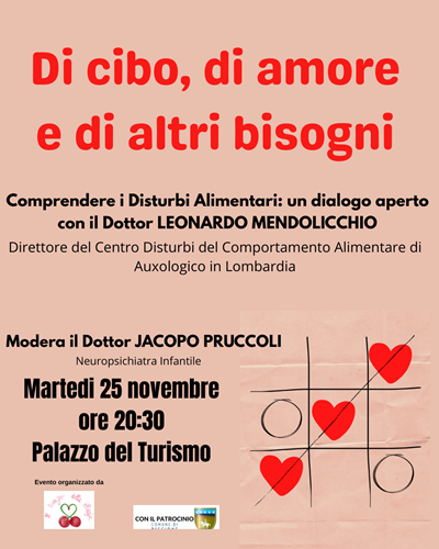 RICCIONE (RN) – Una serata per capire, confrontarsi e riconoscere i segnali che arrivano dal rapporto con il cibo: il 25 novembre alle 20:30, al Palazzo del Turismo (piazzale Ceccarini 11), l’associazione “Il tempo delle ciliegie” invita all’incontro pubblico “Di cibo, di amore e di altri bisogni. Comprendere i disturbi alimentari”, tenuto da Leonardo Mendolicchio, noto psichiatra e psicoanalista specializzato nella cura dei disturbi del comportamento alimentare. A moderare il dialogo sarà Jacopo Pruccoli, neuropsichiatra infantile.