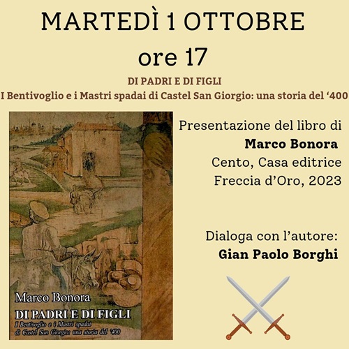 FERRARA – Racconta la storia di due potenti famiglie del ‘400, fra Bologna e Ferrara, il romanzo storico di Marco Bonora dal titolo “Di padri e di figli” (Cento, Casa editrice Freccia d’Oro, 2023) che martedì 1 ottobre 2024 alle 17, sarà presentato nella sala Agnelli della biblioteca comunale Ariostea (via Scienze 17 Ferrara).
