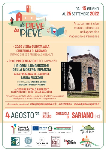 GROPPARELLO (PC) – Giovedì 4 agosto, a partire dalle ore 20.30, presso l’Oratorio di Santa Maria della Neve detto La Chiesuola di SARIANO di Gropparello (PC) si aprirà una serata fatta di arte, letteratura e gusto.